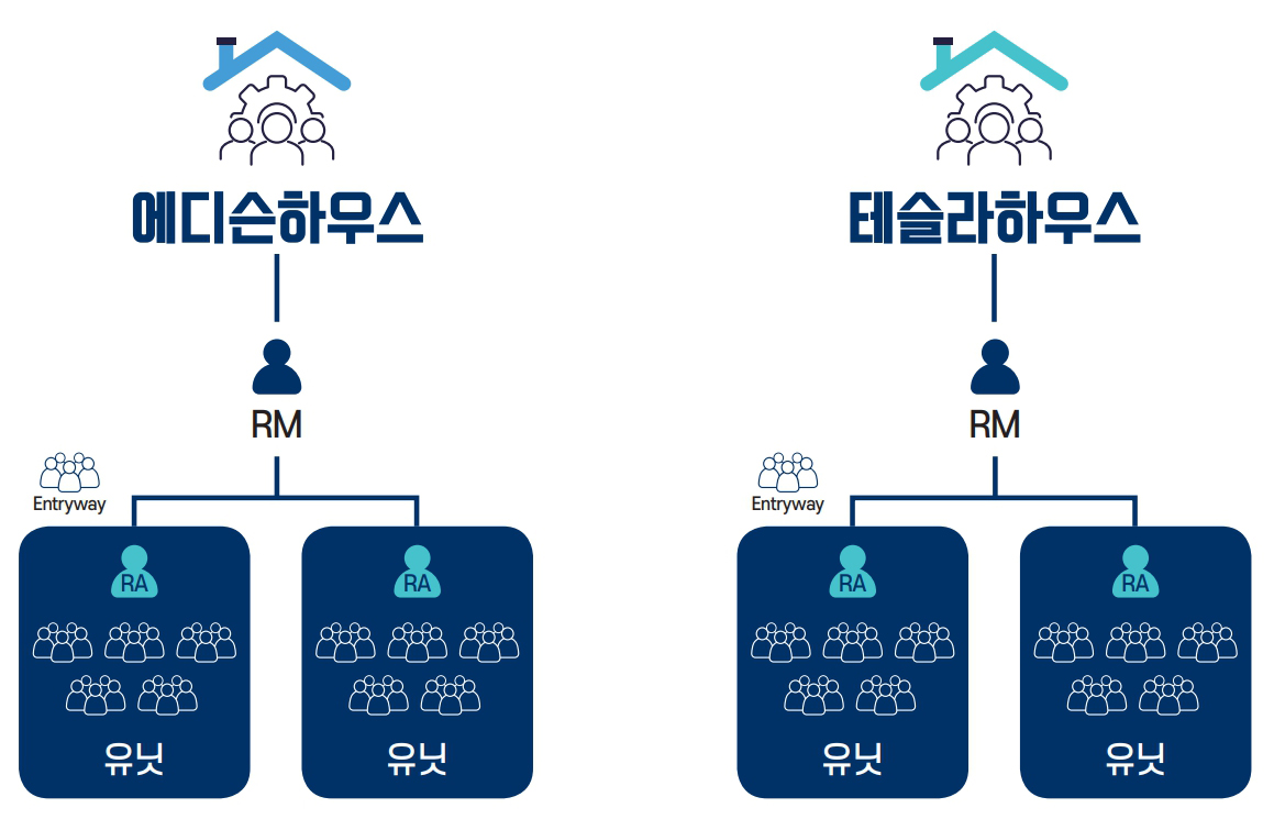 RC House의 조직: 각 하우스의 RC 교육 총괄책임자로 Residential Master가 있으며, RC교육의 조교이며 학생들의 멘토역할을 하는 재학생 혹은 대학원생 Residential Assistant, RC학생들로 구성